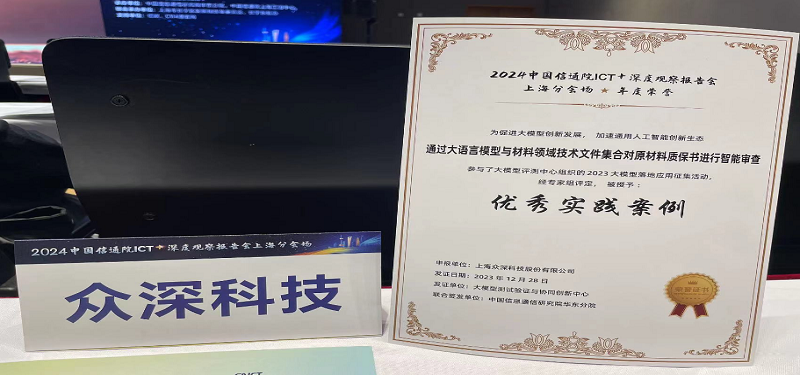 在2024中国信通院ICT+深度观察报告会上海分会场暨“虹桥之源”大模型驱动数字经济新生态峰会上,首部聚焦大模型落地应用的权威成果《2023大模型落地应用案例集》(以下简称“《案例集》”)重磅发布。众深科技提供的《通过大语言模型与材料领域技术文件集合对原材料质保书进行智能审查》案例经专家评审组评定被授予优秀实践案例。