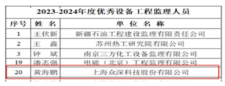 2023年8月-12月在设备监理行业开展的2023-2024年度优秀设备工程监理单位和监理人员评选工作中,上海众深科技股份有限公司被评选为优秀设备工程监理单位,黄海鹏被评选为优秀设备工程监理人员,并颁发了证书。这是众深股份第六次获得优秀设备工程监理单位奖,黄海鹏同志是我公司第4位获得优秀设备工程监理人员。