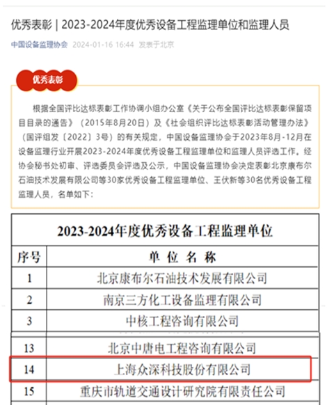 众深股份获2023-24年度优秀设备工程监理单位